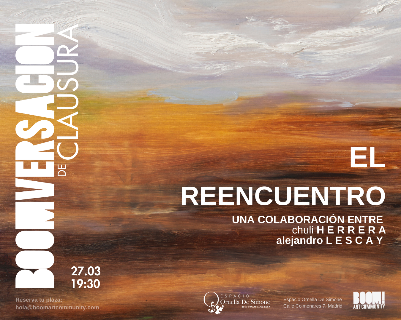 El próximo jueves, 27 de marzo a las 19:30 nos reunimos en el Espacio Ornella De Simone (Calle Colmenares 7, Madrid) para la ##boomversación de clausura de «El Reencuentro», una exposición en colaboración entre Chuli Herrera y Alejandro Lescay.