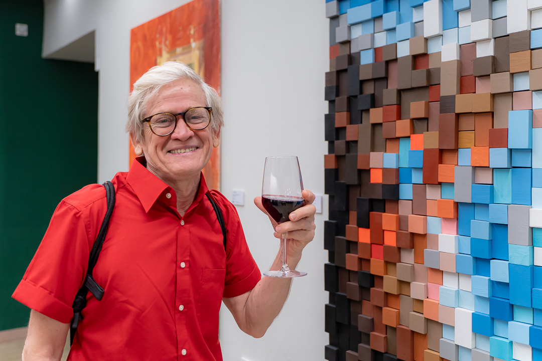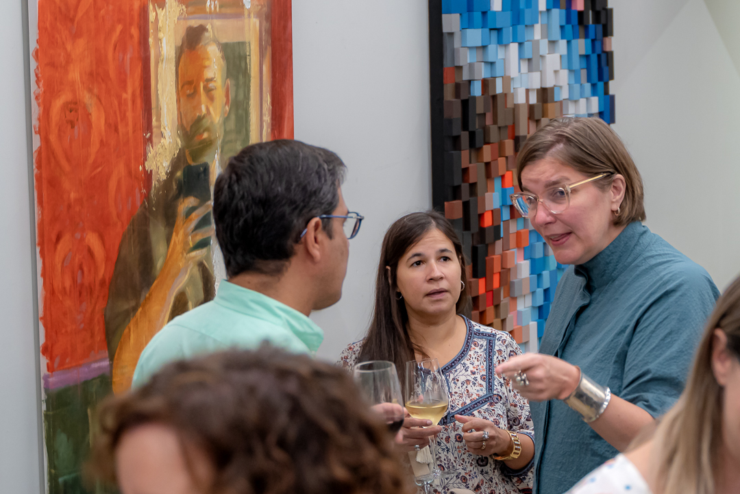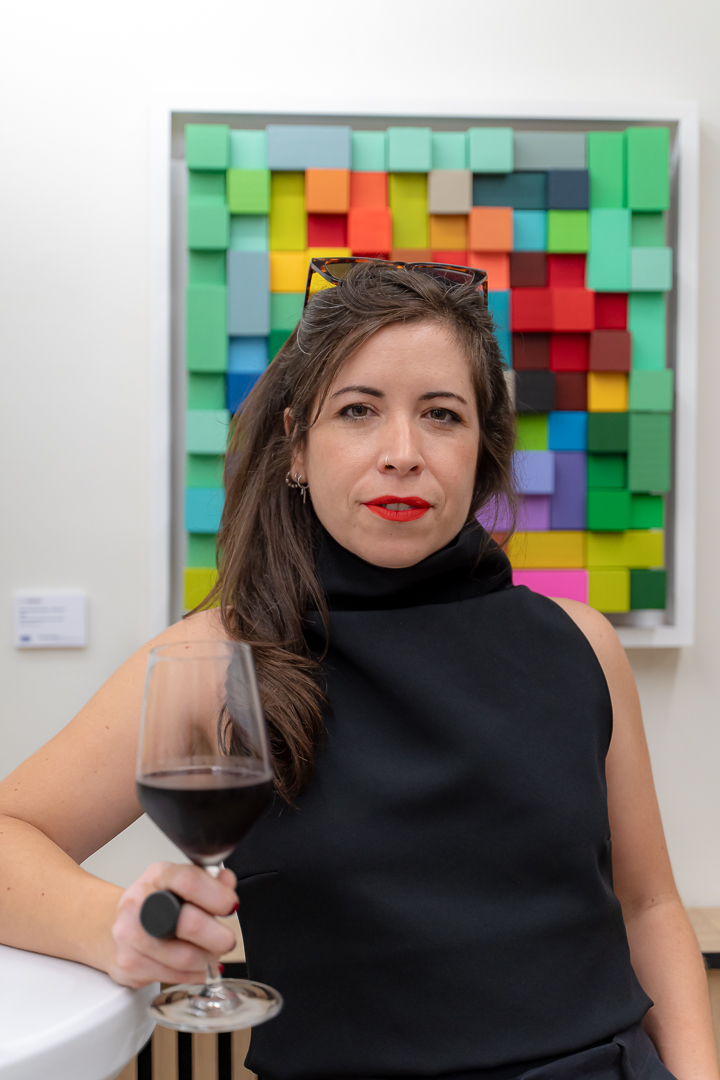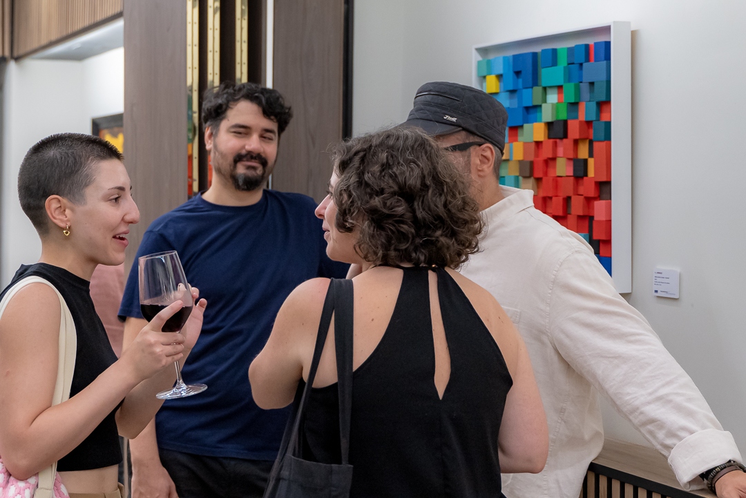 Por otro lado, Eva Menezz aborda la imagen desde una perspectiva más atmosférica y cromática, utilizando cubos de madera de diversos colores, para construir composiciones que representan una estética distorsionada de la imagen. Su trabajo, en apariencia geométrico y rígido, es en realidad una danza de formas y sombras que, cuando se observan con detenimiento, revelan paisajes, figuras, y escenas que habitan en algún rincón de la memoria colectiva. Menezz juega con la idea de un “bloque” como unidad mínima de la imagen en donde crea un universo de infinitas combinaciones cromáticas explorando las interacciones entre los distintos colores y la subjetividad de la percepción visual por asociación. Su proceso de creación introduce una materialidad palpable y artesanal al cortar, lijar, pulir y pintar cada cubo de madera, contrastando con la intangibilidad la imagen en sí. Sus obras, como una suerte de mosaico contemporáneo, obligan al espectador a reconstruir mentalmente lo que a primera vista parece descompuesto. A medida que el espectador se aleja o se acerca, las composiciones de Menezz pasan de la abstracción geométrica a la revelación de formas más figurativas, jugando con la percepción y desafiando la forma en que construimos y percibimos las imágenes y el mundo a nuestro alrededor.