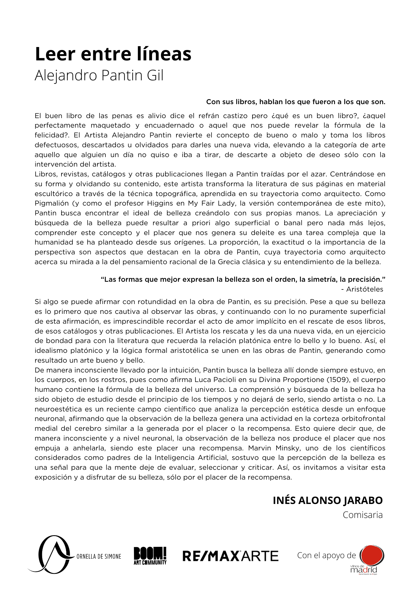Como parte del Ecosistema Cultural de BOOM!, sus muestras se caracterizan por no limitarse a lo expositivo si no buscar a su vez generar comunidad, una forma de simbiosis artística. Leer entre líneas contará con una visita guiada con el artista y la Comisaria el 25 de octubre, una boomversación sobre arte y arquitectura con otros profesionales, una recogida de libros y la creación progresiva de una obra interactiva durante la exposición y sus simbiosis. Hasta el 8 de noviembre en Remax Arte Madrid.