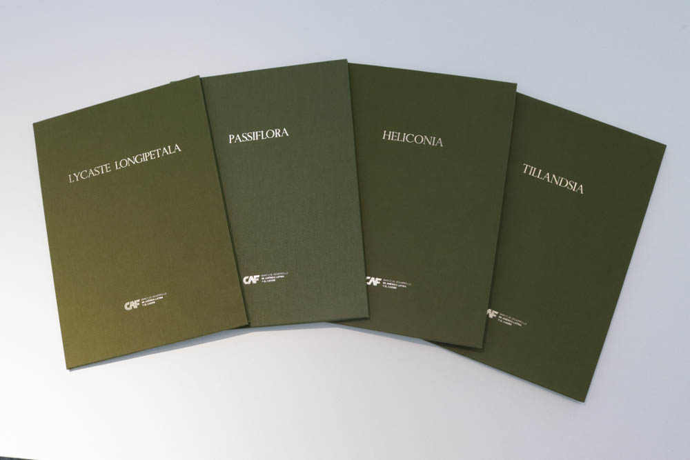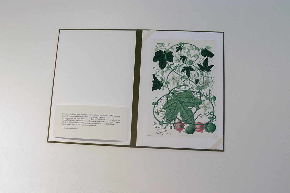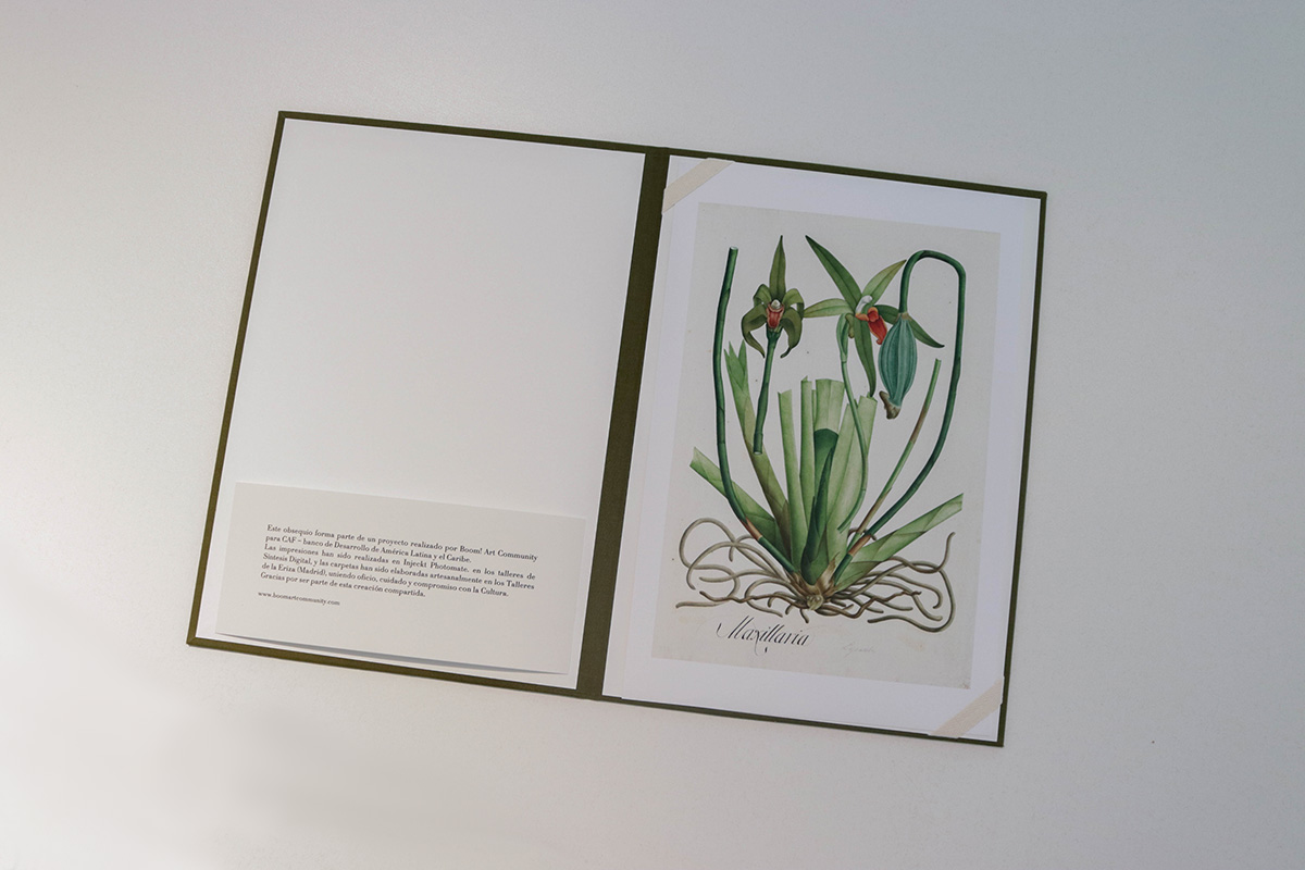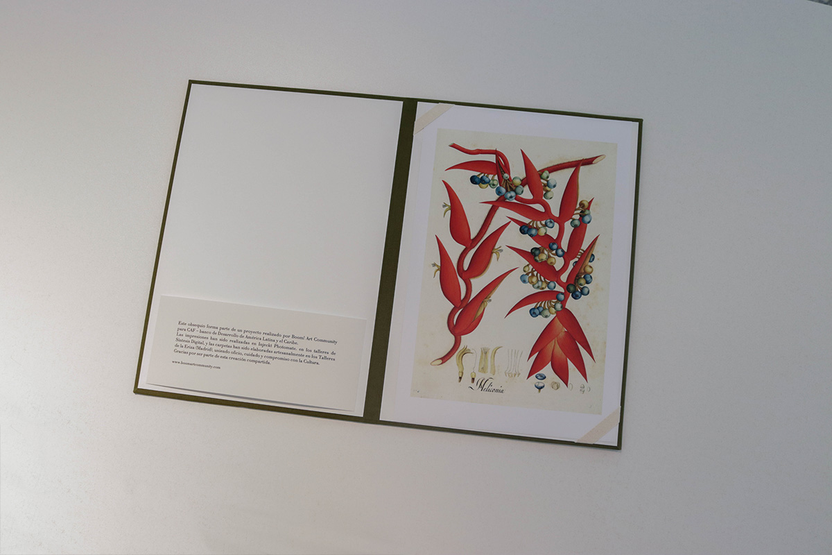 Como parte del proyecto, y en sintonía con el espíritu ilustrado de la Real Expedición Botánica, se produjo una edición especial concebida como obsequio: una carpeta que reúne una cuidada selección de impresiones realizadas a partir de las piezas expuestas. Cada una de estas carpetas fue elaborada a mano en el taller de encuadernación tradicional La Eriza, en Madrid. Ejecutadas una a una, combinan técnicas artesanales con materiales de alta calidad, reflejando una apuesta decidida por el trabajo manual, el esmero en cada detalle y el apoyo a los oficios y comercios locales.