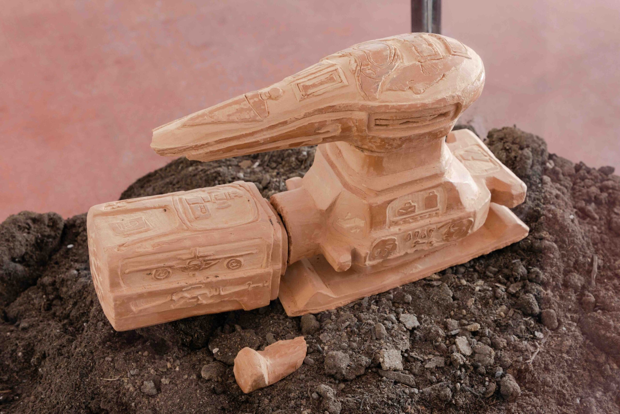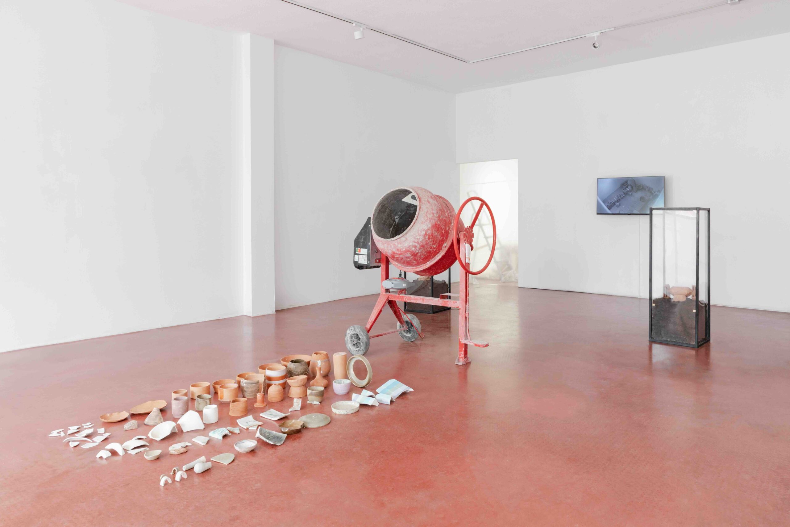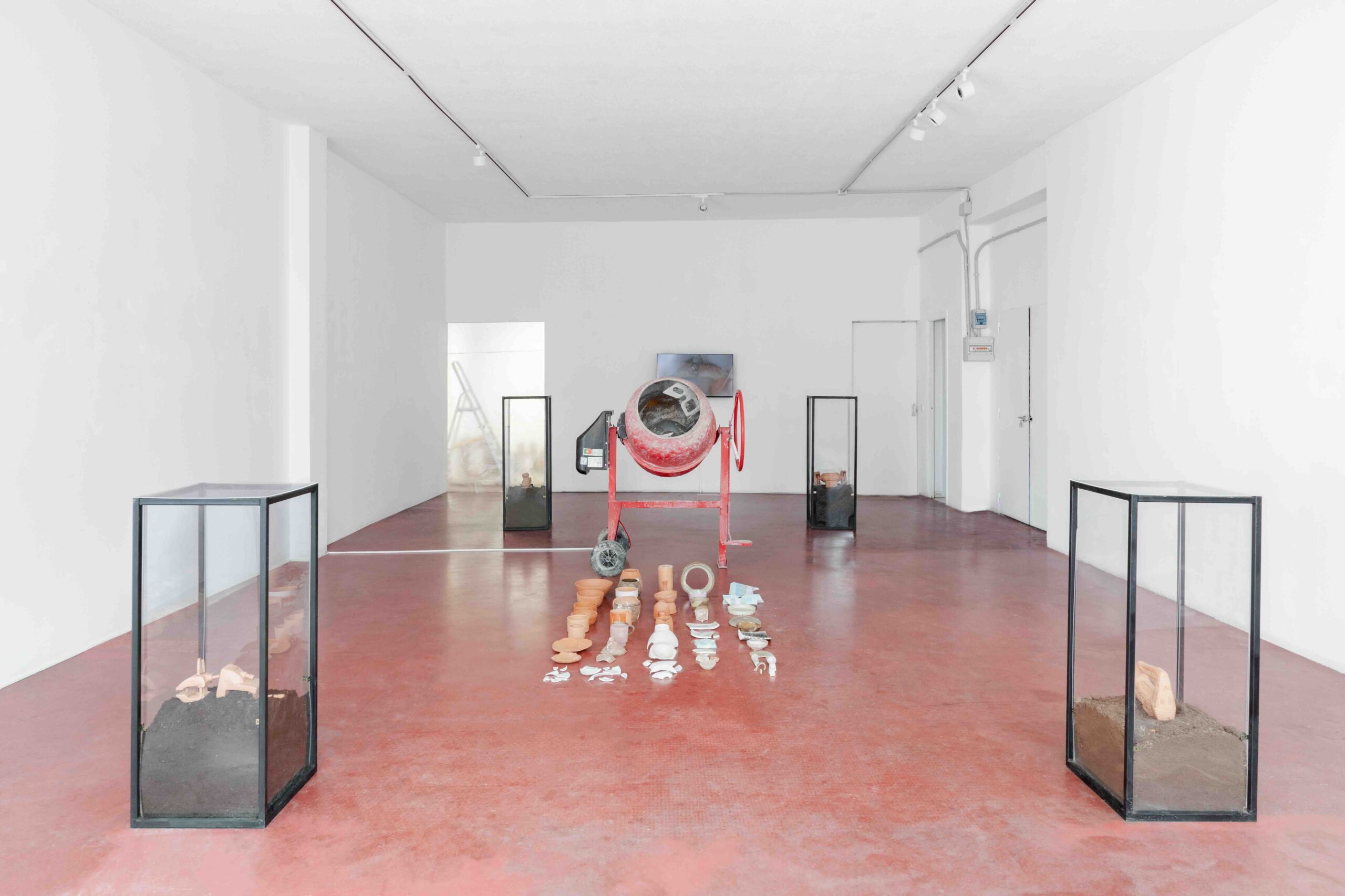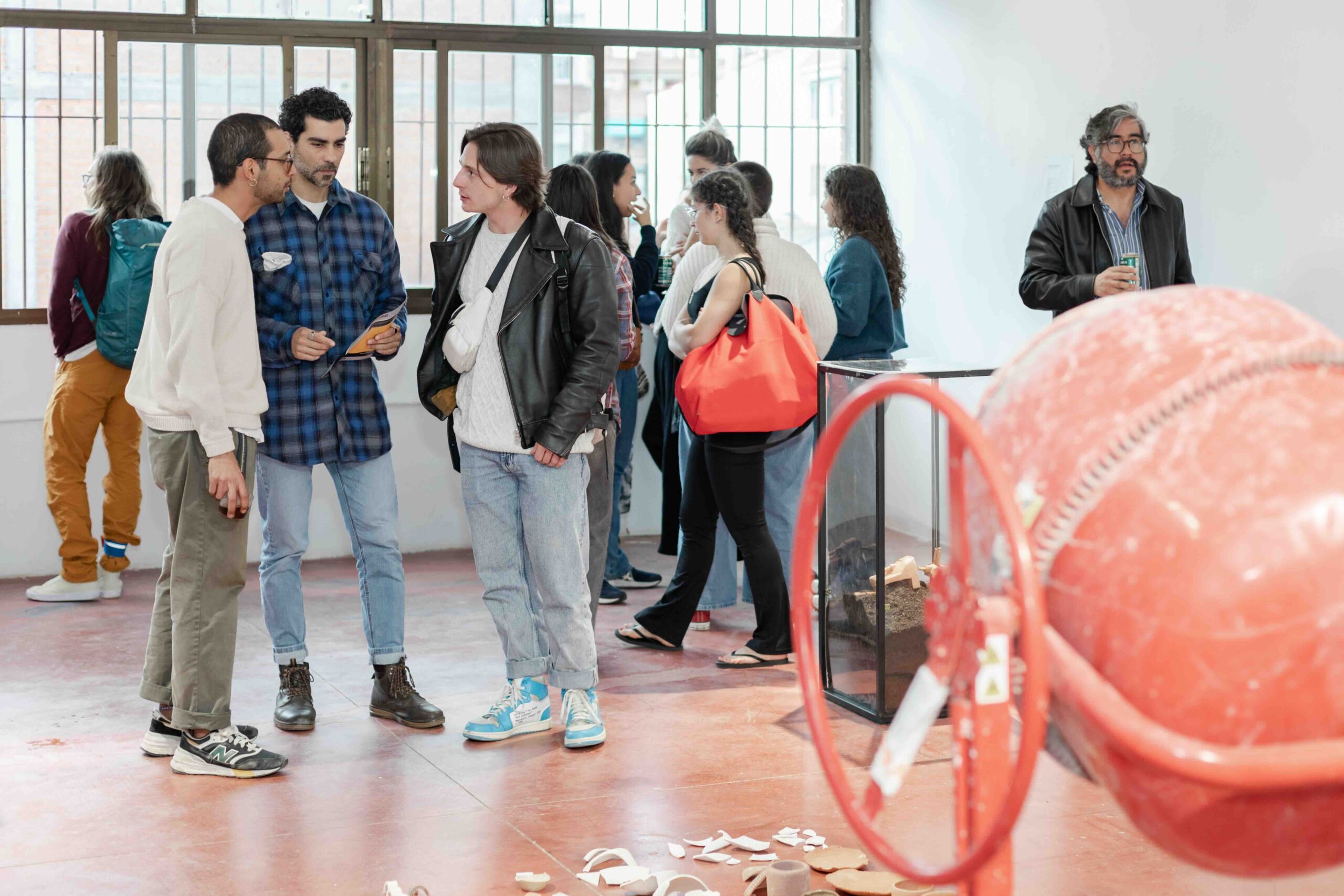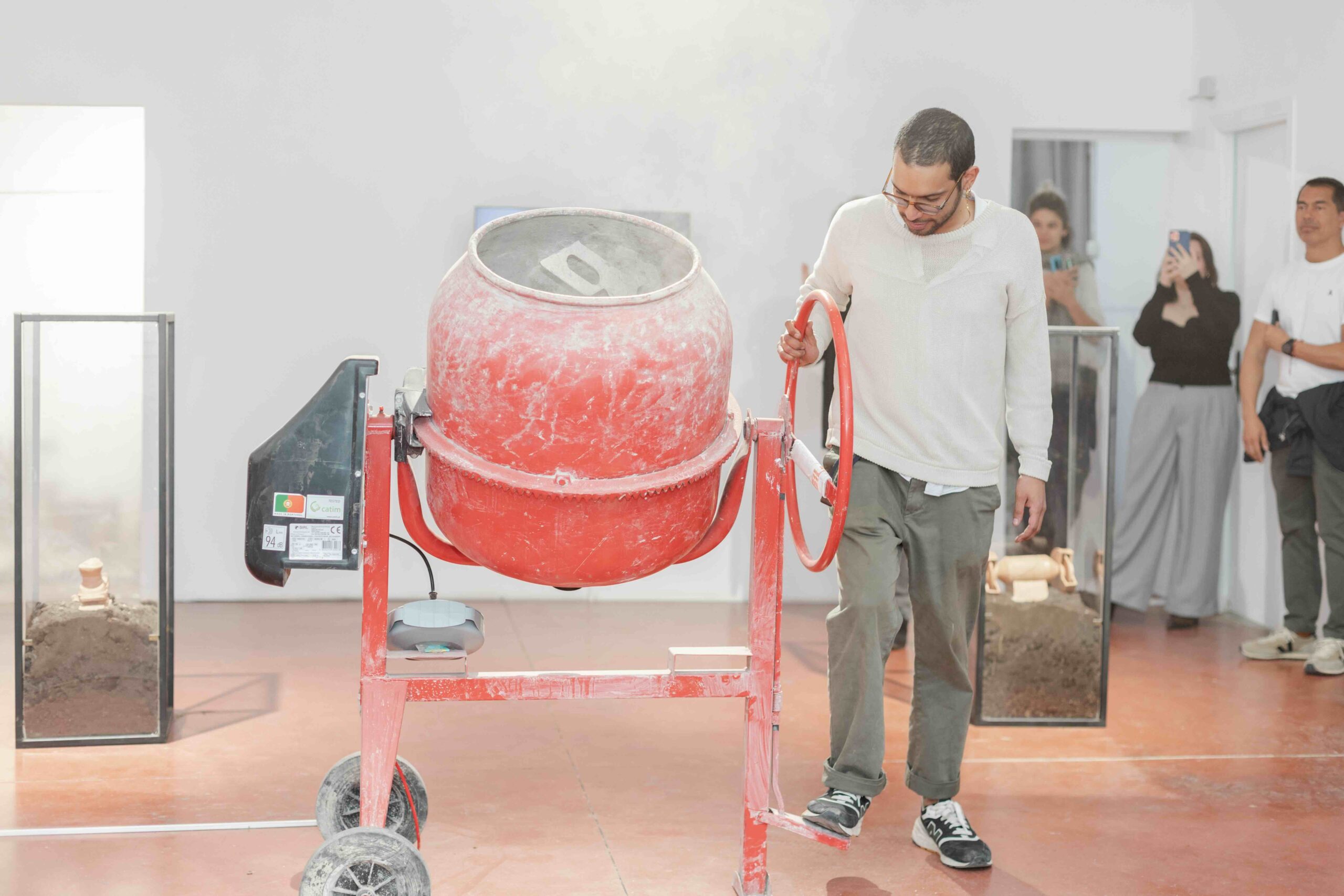 Las obras operan como preguntas materiales: la arcilla aparece no solo como soporte, sino como lenguaje ancestral, con una carga densa de memoria y resistencia. La tierra —literal y simbólica— deviene en archivo, testigo silente de un pasado colonial que sigue organizando el presente. Una hormigonera, instalada en el espacio expositivo, se transforma en escultura activa: en su rotación incesante parece amasar la historia de una ciudad edificada por cuerpos invisibilizados, por manos extranjeras que aún sostienen los cimientos de lo común. Y un neologismo creado por el propio artista conceptualiza el dolor sin nombre que afecta a todo migrante como dolencia colectiva, que atraviesa cuerpos, estructuras y tiempos: Migralgia.