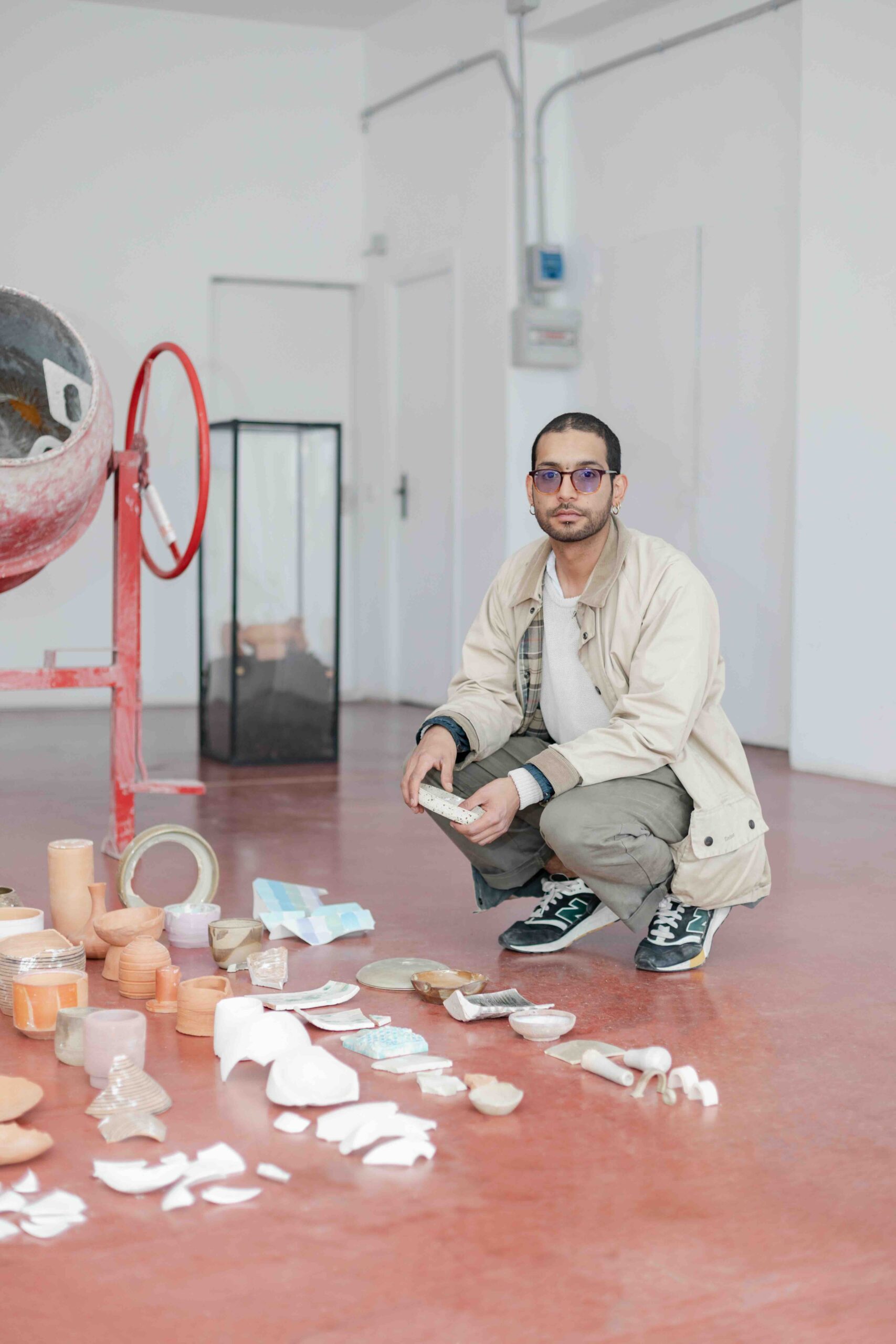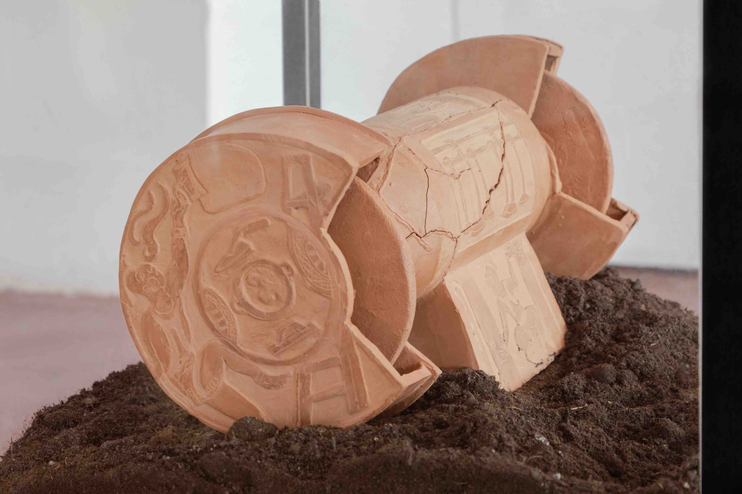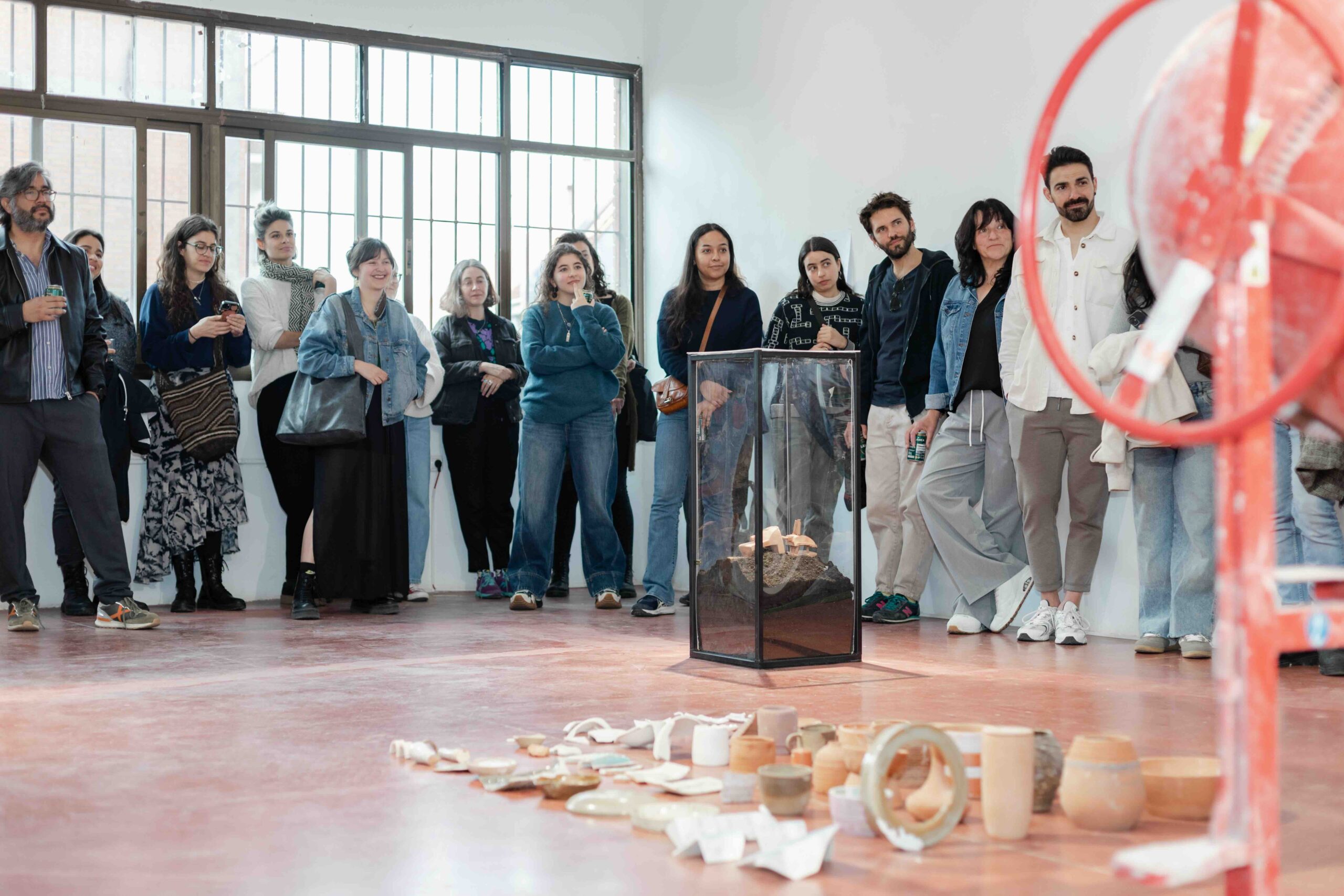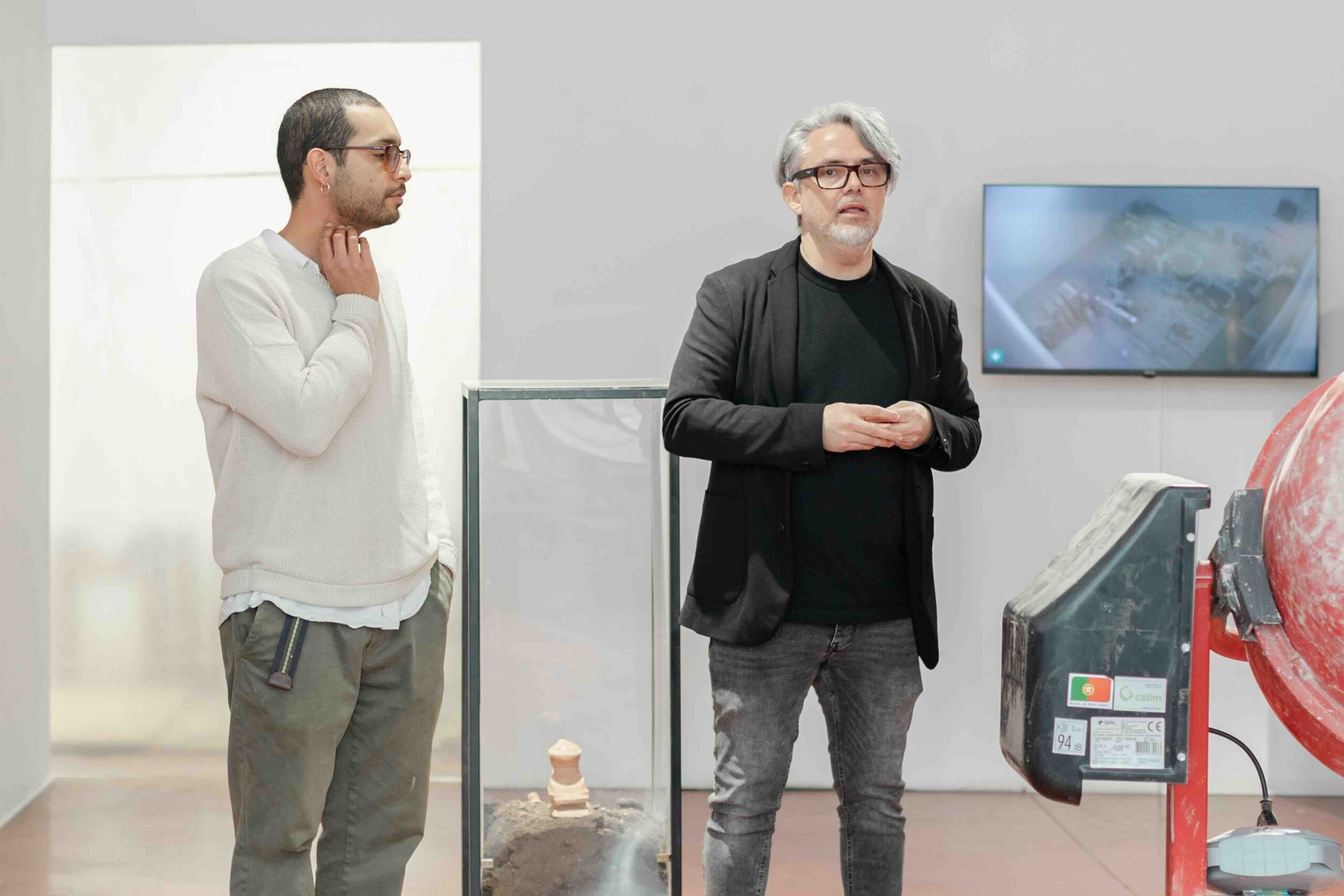 Las obras operan como preguntas materiales: la arcilla aparece no solo como soporte, sino como lenguaje ancestral, con una carga densa de memoria y resistencia. La tierra —literal y simbólica— deviene en archivo, testigo silente de un pasado colonial que sigue organizando el presente. Una hormigonera, instalada en el espacio expositivo, se transforma en escultura activa: en su rotación incesante parece amasar la historia de una ciudad edificada por cuerpos invisibilizados, por manos extranjeras que aún sostienen los cimientos de lo común. Y un neologismo creado por el propio artista conceptualiza el dolor sin nombre que afecta a todo migrante como dolencia colectiva, que atraviesa cuerpos, estructuras y tiempos: Migralgia.
