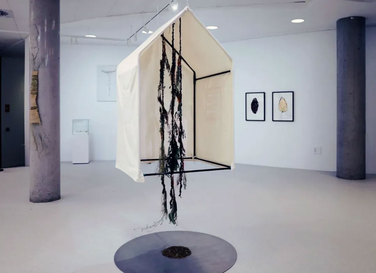 En el caso de Solange Contreras, su trabajo se fundamenta en los procesos artísticos y en la carga simbólica de los materiales. Utiliza técnicas textiles con las que combina materias naturales y residuos industriales, creando con su arte la necesidad de mirar despacio para reformular nuestra relación con el tiempo y con el entorno, llamando a recuperar formas de hacer ancestrales más justas y sostenibles para el cuidado del territorio y de aquellos que lo habitan.